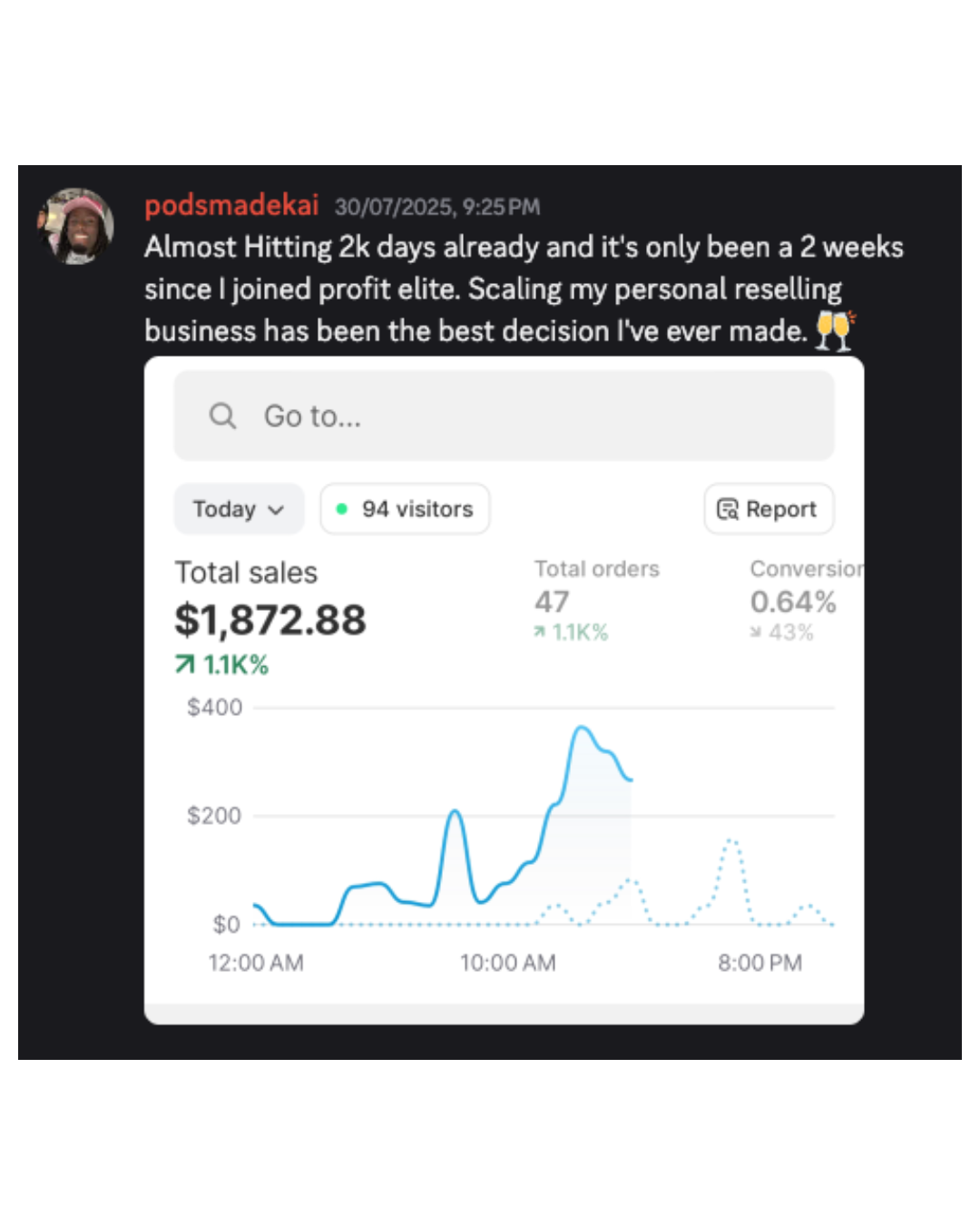 Profit Elite is a premium membership giving you exclusive access to everything I use to grow my reselling business. You get access to over 1,000 trusted suppliers, my personal product picks, exclusive bulk deals, detailed video tutorials, full resellers and ecommerce guides, and step-by-step selling and marketing blueprints, all designed to help you profit faster and smarter.